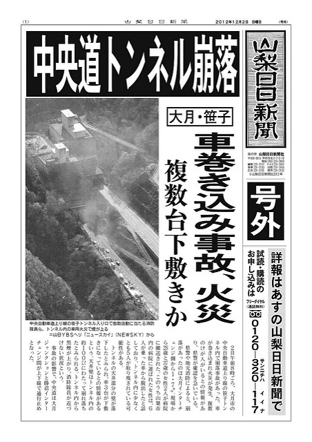 笹子トンネル事故は、かなりの部分が人災であって、個人的にも頻繁に利用する場所であるために、大変大きな衝撃を受けています。この件については、エクシブ蓼科へのアクセスルートであることもあって、情報をまとめようと考えていますが、今はちょっと気持ちの整理がついていません。