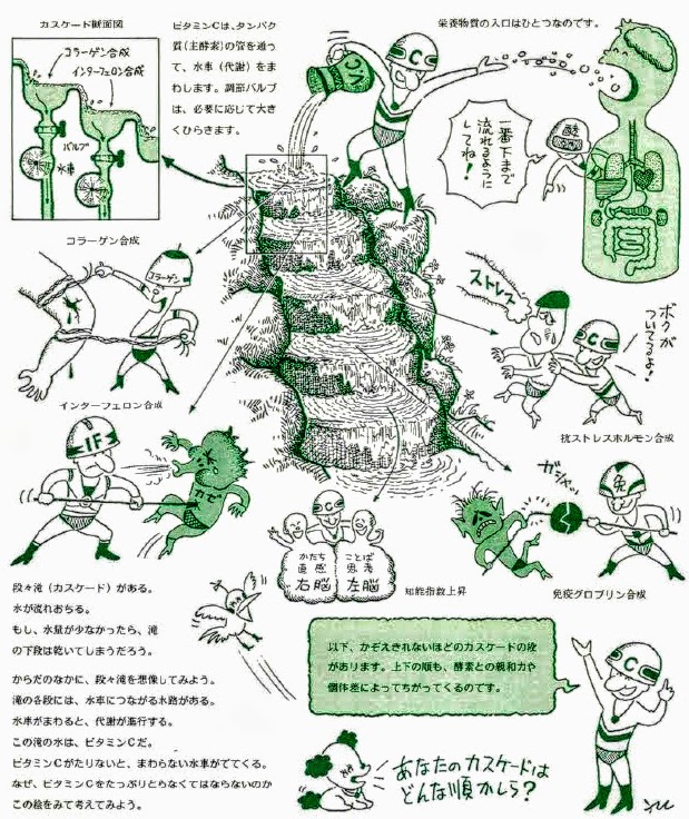 「カスケード」というのは滝という意味です。滝に流れる水をビタミンと考え、段々になっている滝に付いている水車が回れば、そこでタンパク質が合成されると考えます。身体の中でタンパク質を作る反応は3000種類以上と言われているので、この仮説ではカスケードには1000単位の段があると考えます。