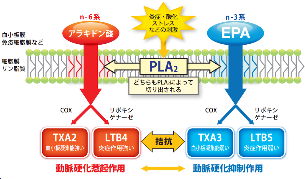 さて、この善玉・悪玉というネーミングは、上記書籍の翻訳の問題なのかもしれませんが、コレステロールのそれと同様で、誤解を招く原因になります。例えば、アラキドン酸から作られるエイコサノイドの仲間には、血液の凝固作用促進と血管や気管支の収縮作用を持つものがあります(トロンボキサンA2)。これは生体の防御作用としては必要なものなので、悪玉と言ってしまうのには抵抗を感じます。