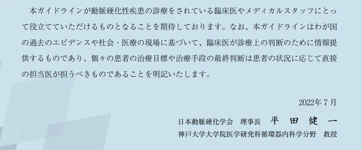 日本動脈硬化学会・理事長・平田健一氏は、本ガイドラインの序文(P6)で次のように書いています。