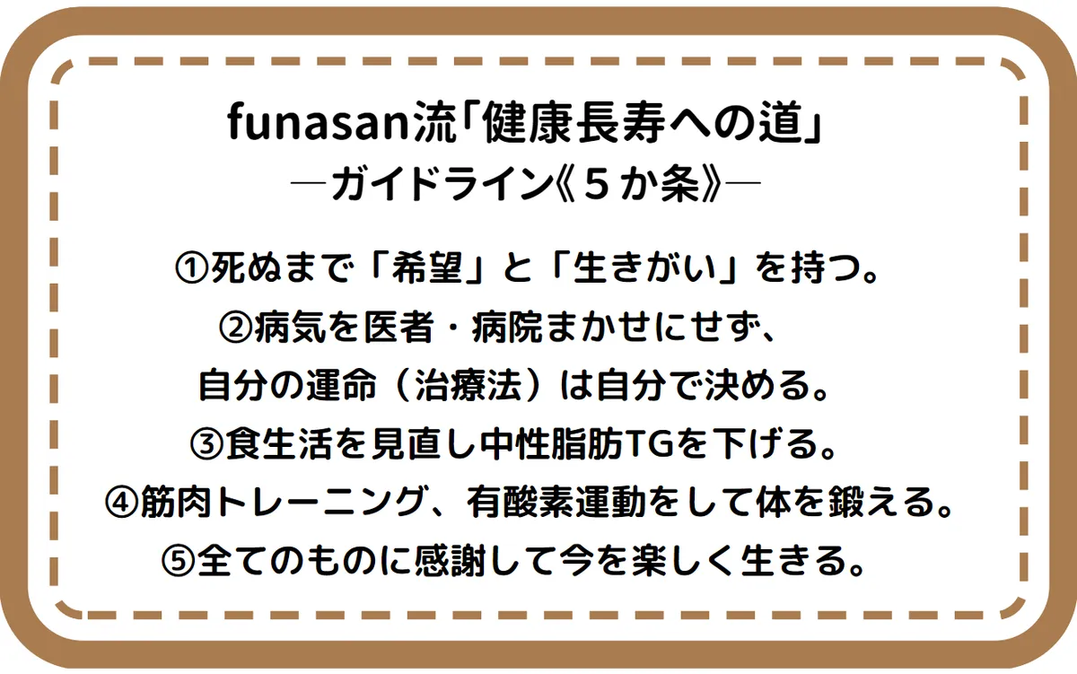 最後になりましたが、funasan流「健康長寿への道」と題して、私が日々心がけ、実践しているガイドライン5か条を皆さまにお贈りして、この連載シーズン2を終わります。