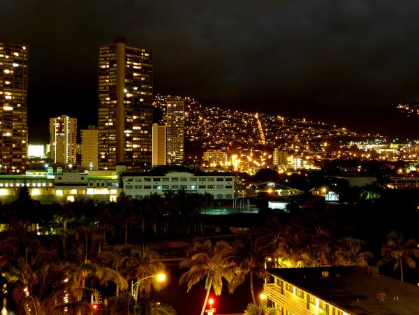 長い長い旅の初日もようやく終わろうとしています。Aloha Towersのお部屋のベッドルームからラナイに出ると、アラワイ運河の向こうにやさしい夜景が広がっていました。日本に置いてきた家族もそろそろ出発の時間です。