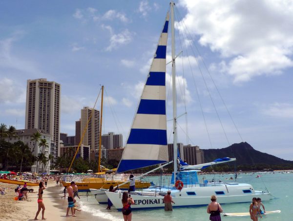 ロイヤル・ハワイアン・センターでのキルト・レッスンを終えて、ビーチまで出て来ました。よく見かけるカタマラン(双胴船)がいくつもビーチに係留されています。ですが、現地で調達した日本語のフリーペーパーなどを見ても、これらがい…