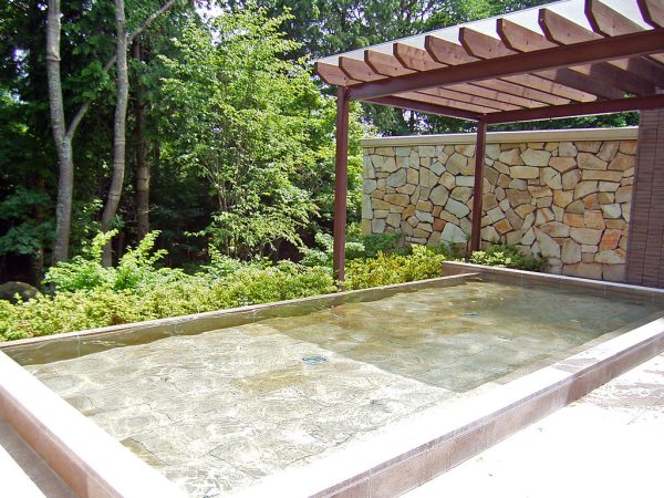 エクシブ軽井沢の露天風呂。残念ながら温泉ではないが、木々に囲まれてとても気持ちのいいお風呂だ。特に夏は、緑がさわやかで気分爽快である。写真は昼間の様子だが、僕が好きなのは夜。まるで森の中にいるような錯覚を覚え、「エクシブ…