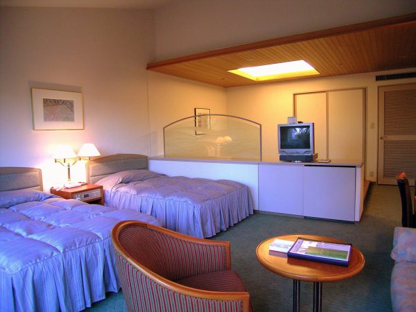 エクシブ軽井沢は全200室あるが、約半分の94室がラージグレードである。写真はラージのほとんどを占める和洋室タイプ(B1タイプ)。テレビが乗っている仕切り家具の向こうがたたみスペースである。