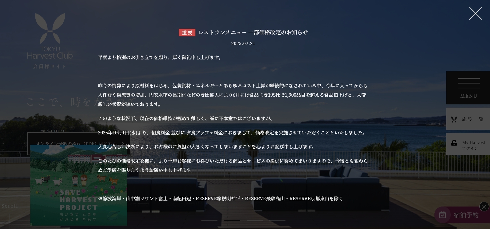 レストランメニュー一部価格改定のお知らせ│お知らせ│東急ハーヴェストクラブ -TOKYU Harvest Club-