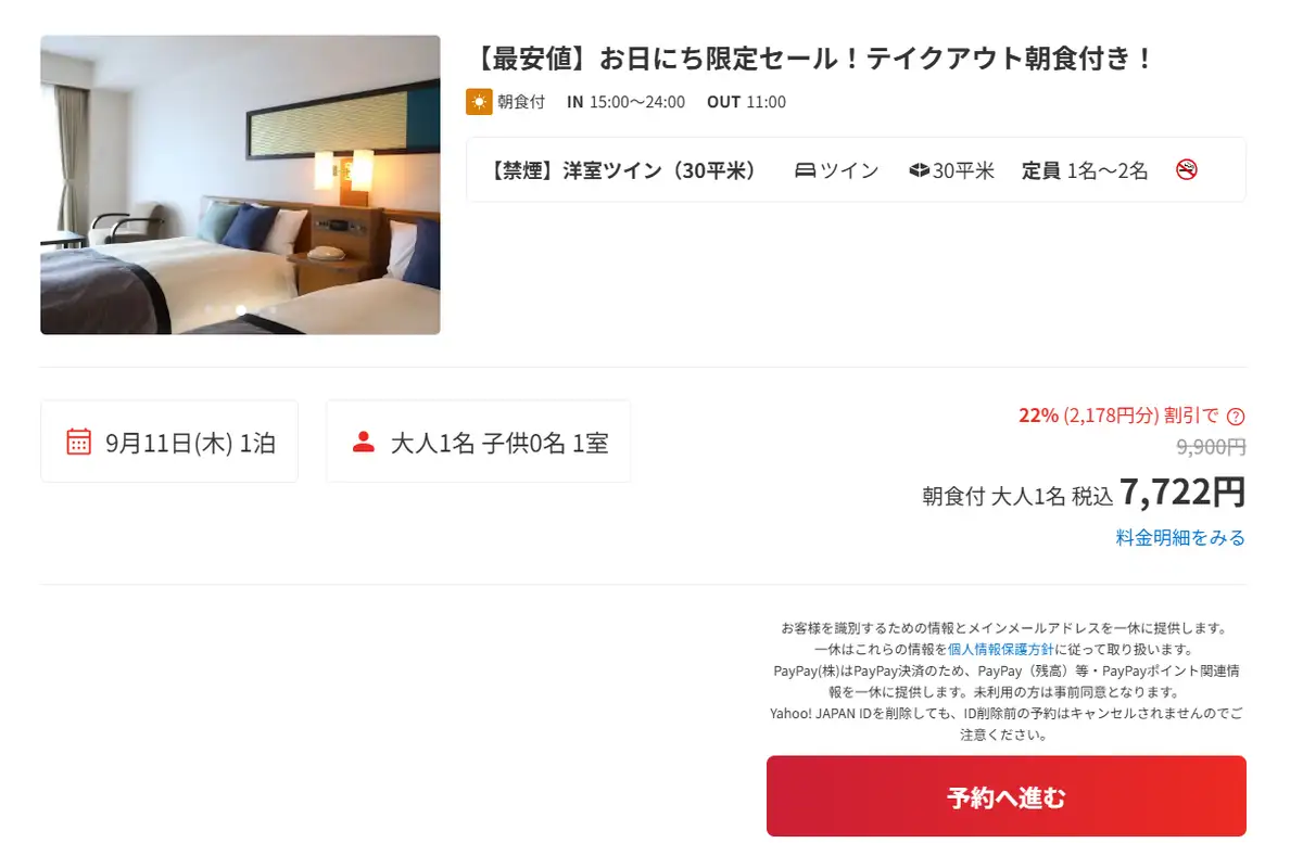 今日おひとりさまで泊まるとすると、朝食付きで7,722円です。安いなぁ。やはりガラ権の一般利用が最高ですね。