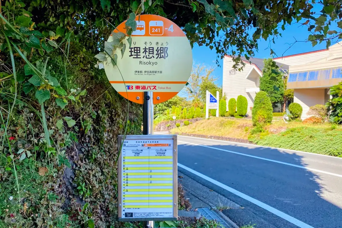 バス停名は「理想郷」です。伊東へのバスは日中に7便あり、だいたい1時間に1本ありますので、けっこう使い勝手がいいのではないでしょうか。最新の時刻表は以下で調べてください。
