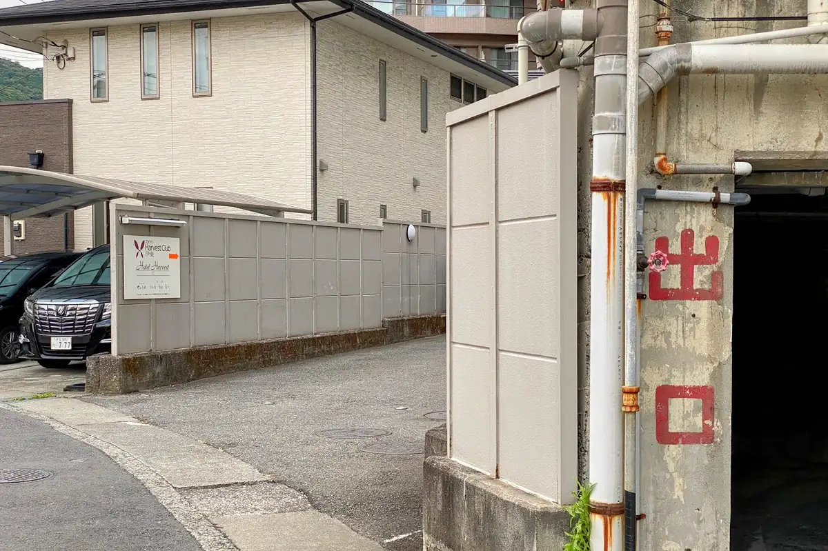 この小道を抜けて、ハーヴェストの裏側からホテルに入る感じです。