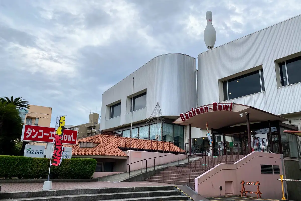 バス停は1階にコメダ珈琲店があるマンションの前に泊まります。その左右に暖香園があります。駅側に旅館ホテル、駅の反対側にダンコーエンボウルです。