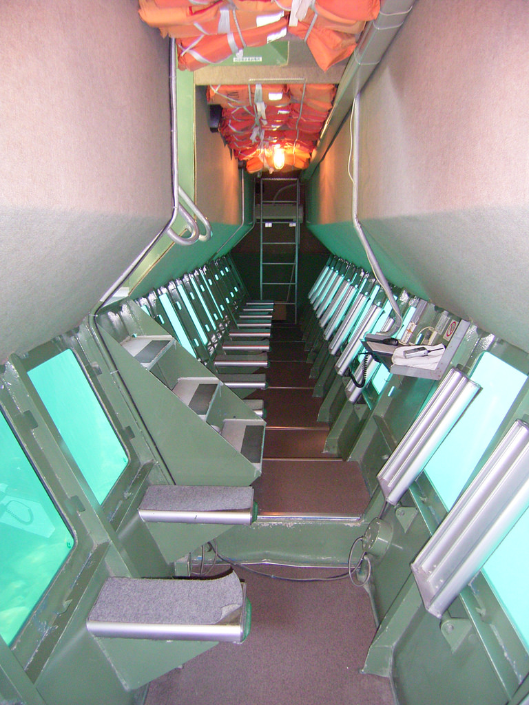 エクシブ初島クラブの海中展望船「シーエクシビュー ノア(SEA XIVIEW NOAH)」の内部。定員は24名。シートの片側が跳ね上げ式になっており、順番に奥から詰めて着席する。1人に対して1つの窓が割り当てられており、クルージングは行きと帰りが同じルートなので、どの席でも当たりはずれはない。