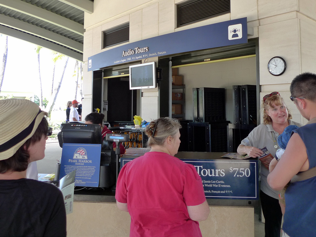 つまりパールハーバーの観光は、絶対に午前中のできるだけ早い時間に行かなければならない、ということなんです。ビジターセンターは朝7時からオープンしています。到着したら、とにかくメイン入口正面のデスクに行き、「船と映画のチケット(movie/boat tickets for the USS Arizona Memorial)」をゲットすることに集中しましょう。