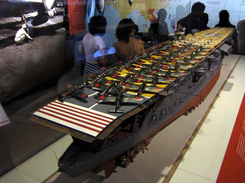 前者では、アメリカと日本が戦争に至るまでのできごとを学べます。帝国海軍の空母「赤城」の模型はぜひ見ておきましょう。