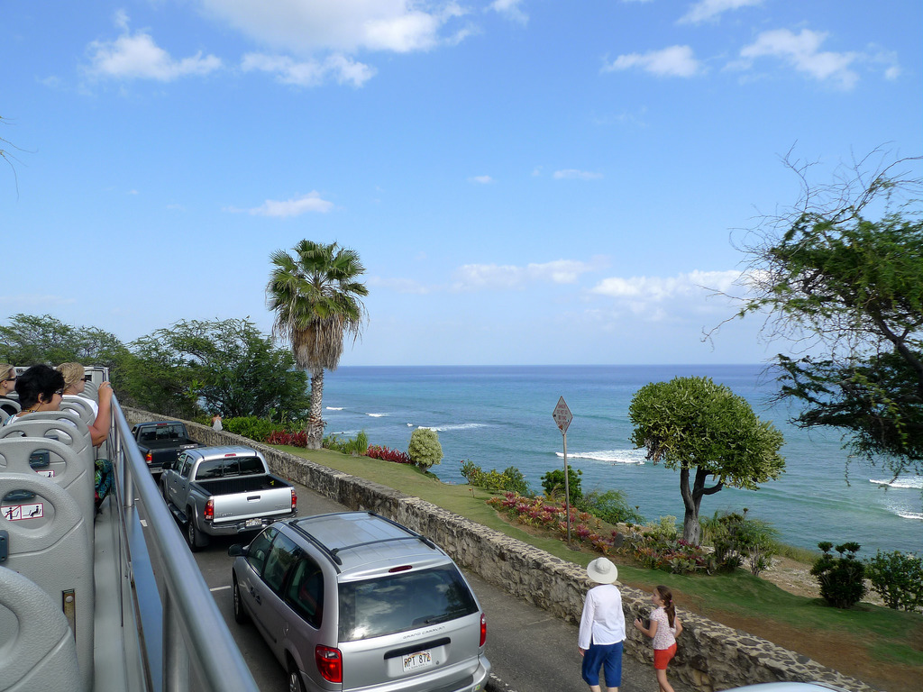 実際のダブルデッカーからの雰囲気が味わえる写真をいくつか紹介します。まずは、ダイヤモンドヘッド方面に行ってみましょう。よくあるのが、カラカウア通りからワイキキ水族館を過ぎ、ダイヤモンドヘッドをぐるっと回って戻ってくるコースです。