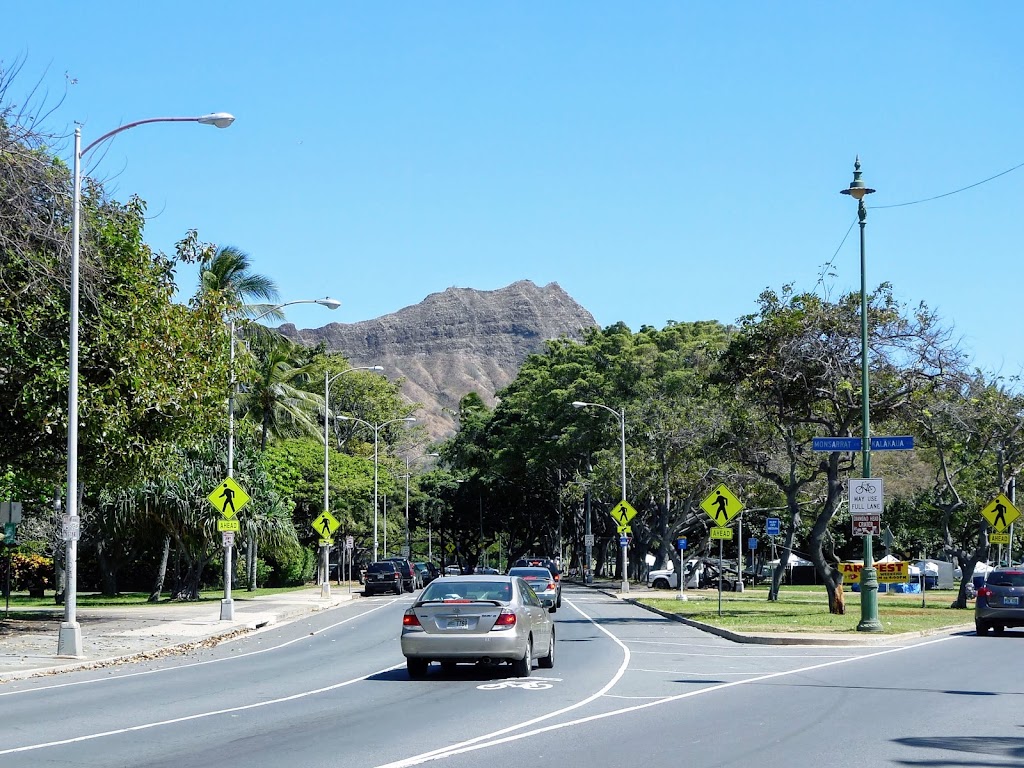 一方通行のカラカウア通りをビーチサイドを南に進むと、カパフル通りを越えた先で道は2つに分かれます。左がモンサラット通りで、まっすぐ行けばKKCファーマーズ・マーケット。ダイヤモンドヘッド登頂へのゲートウェイです。
