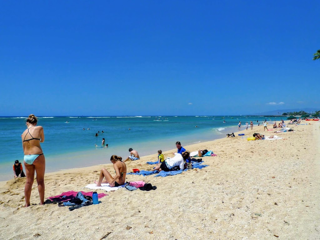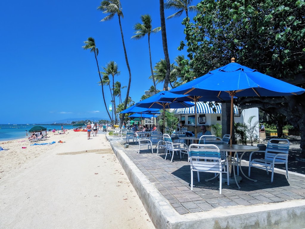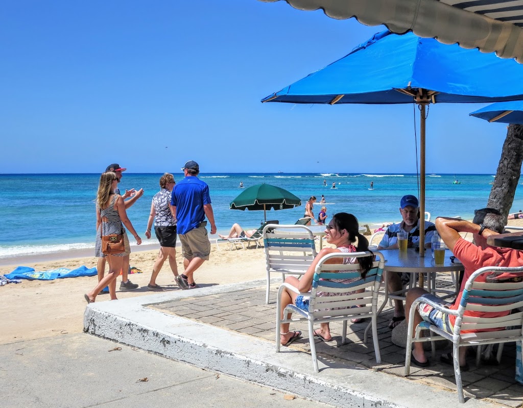 真っ昼間から「ほとんど砂浜の上」でビールを飲んでいる人たちで賑わいます。場所は、ハレクラニから砂浜沿いにヒルトン・ハワイアン・ビレッジに向かって進んだ辺りで、ワイキキショアの少し先です。