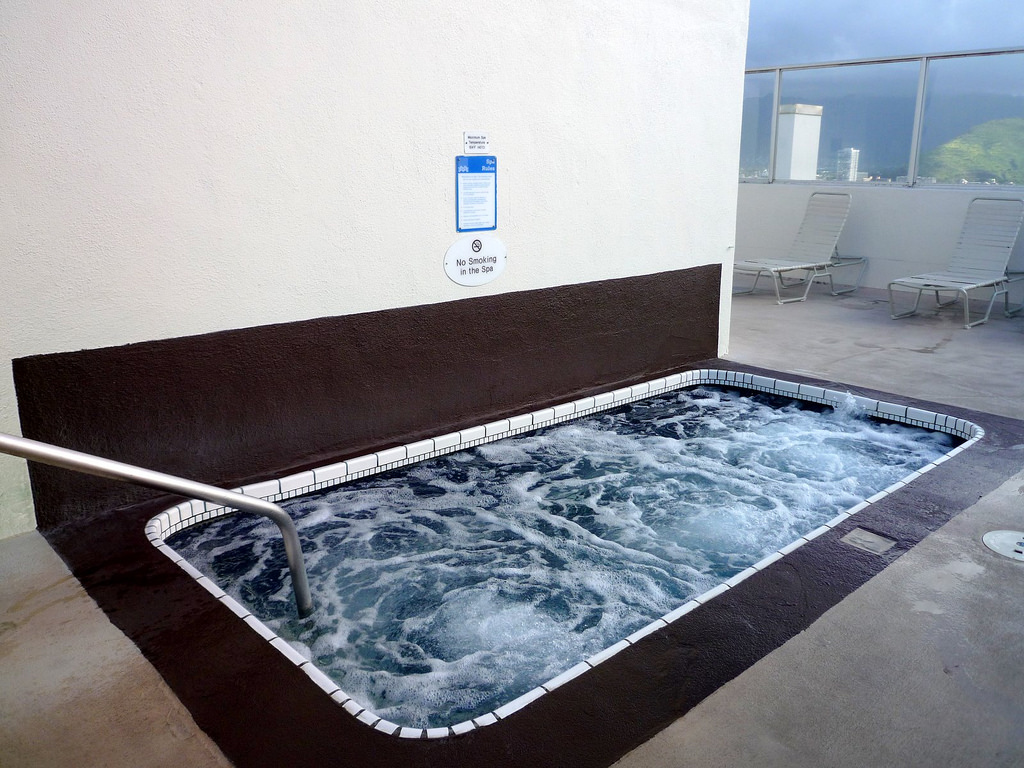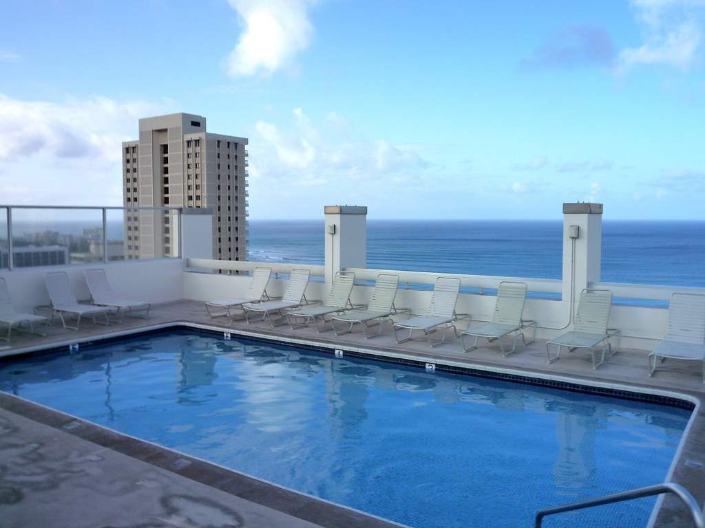 アストン・パシフィック・モナーク(パシモナ)の最大の美点は、この屋上にある温水プールかもしれません。ホテルがひしめくワイキキですから、屋上や上層階にプールのあるホテルは他にもありますが、これだけ眺望のよいプールは他にはないのではないでしょうか。