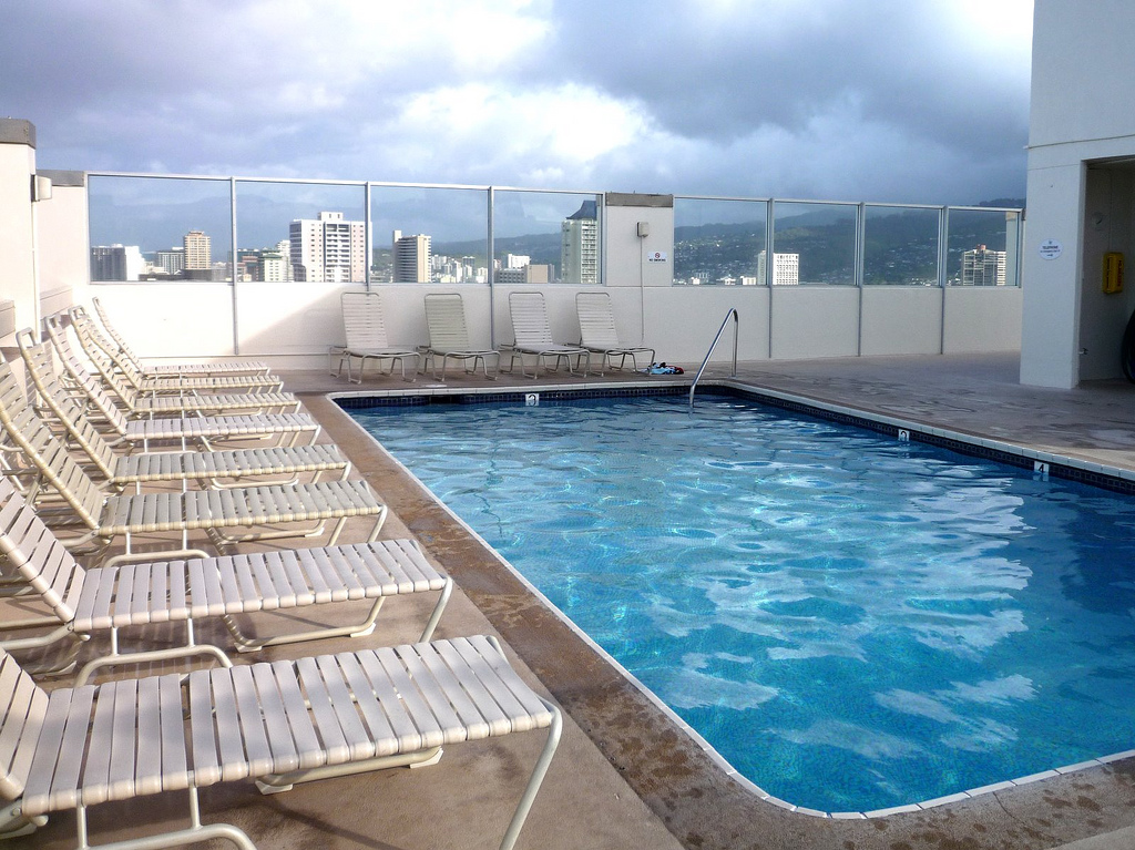 ワイキキのホテルはたいてい屋上にプールがありますが、これは消防用という意味合いもあるのかもしれませんね。