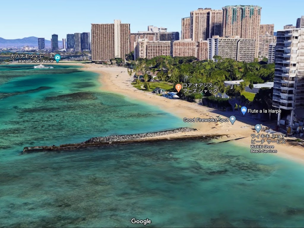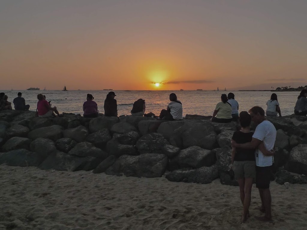 場所はタイトルにあるように、ワイキキショアの前の堤防です。おそらくここがサンセットスポットとしては一番有名ではないかと思います。