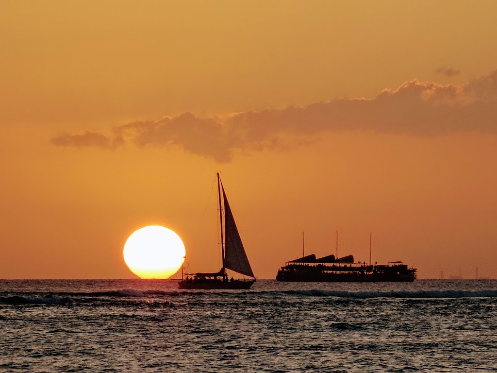 ワイキキで夕陽を眺める、というテーマの記事は、過去にも何度か書いていると思うのですが、今日のは極め付きのやつです。ちなみに、夏休みにハワイに行っている人はこういう景色は見れません。海に沈むサンセットを見られるのは10月~4月ごろだけです。写真は3月下旬の一例。