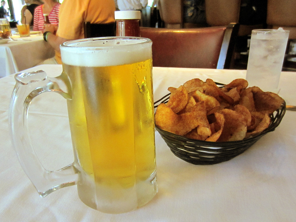 着席してメニューを眺めていると、何も注文していないのにハウスメイドのポテトチップスが運ばれてきました(これはオマケです)。ま、まずはこれで飲みましょう。ドラフトビールは5ドルです(ハッピーアワー価格)。メニューには銘柄が書かれていなかったので、まずは土地のものを、ということで、ハワイアンの生ビールを、と注文しました。