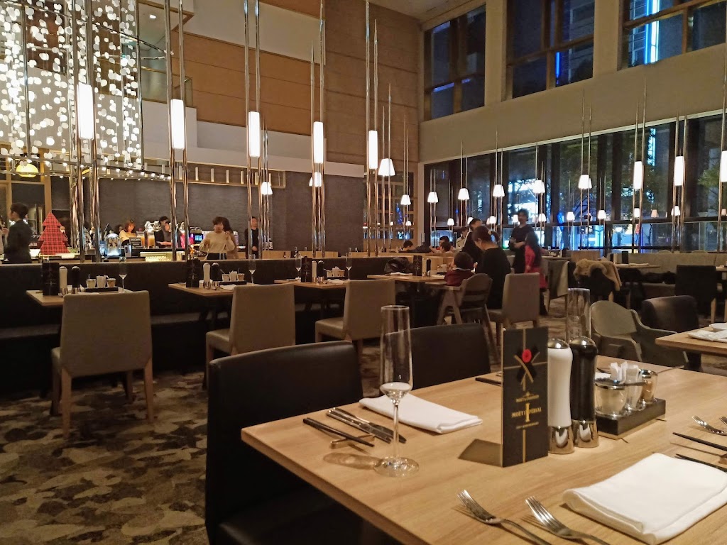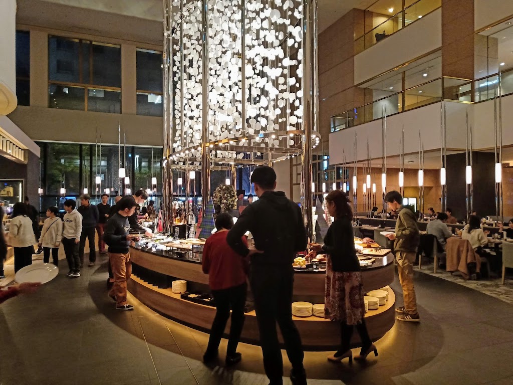 ヒルトン名古屋では、昨年12月にロビーフロアを改装して、オールダイニングのブッフェレストラン「インプレイス3-3」が開業しています。自分は、以前の閑散としたロビーフロアの雰囲気が強く印象にあったので、特に予約もせず、ブッフェ開始の17時30分に飛び込みで行ってみました。
