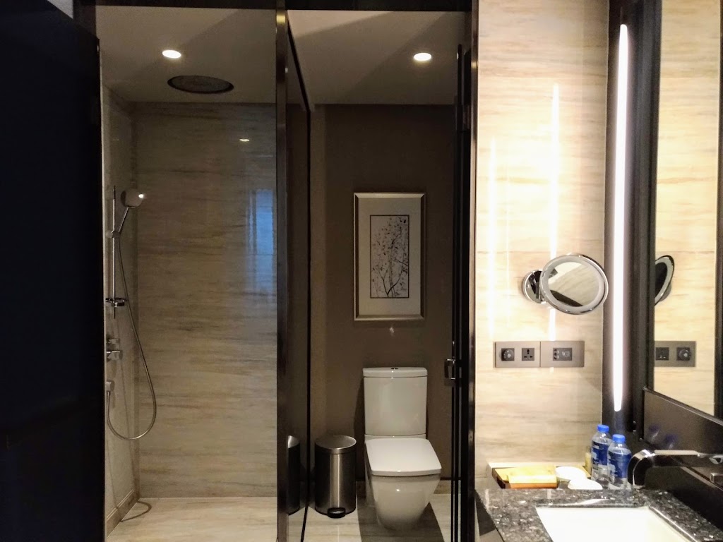 次に、水回りを見てみます。こちらがバスルームの様子。かなり質感が高いのがわかると思います。マカオや中国、台湾の高級ホテルはこういう感じの仕上げが多いですね。バスタブもゆったりしていて、長旅の疲れを癒やすのには十分です。