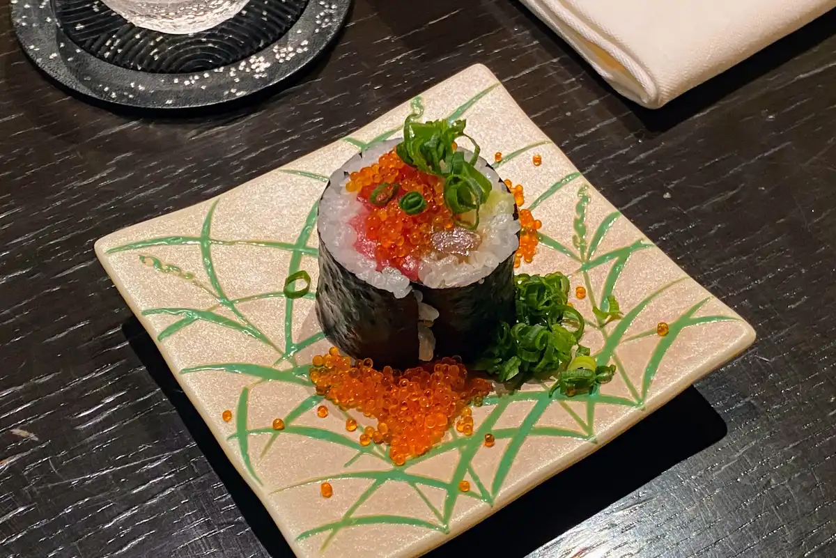また、こちらは黒潮で出していただいた巻きずしです。恵方巻って切っちゃいけないみたいなので、恵方巻ではないですかね。また、コース自体が食べられなくなってもいけないので、一口のアミューズ的な感じでした。