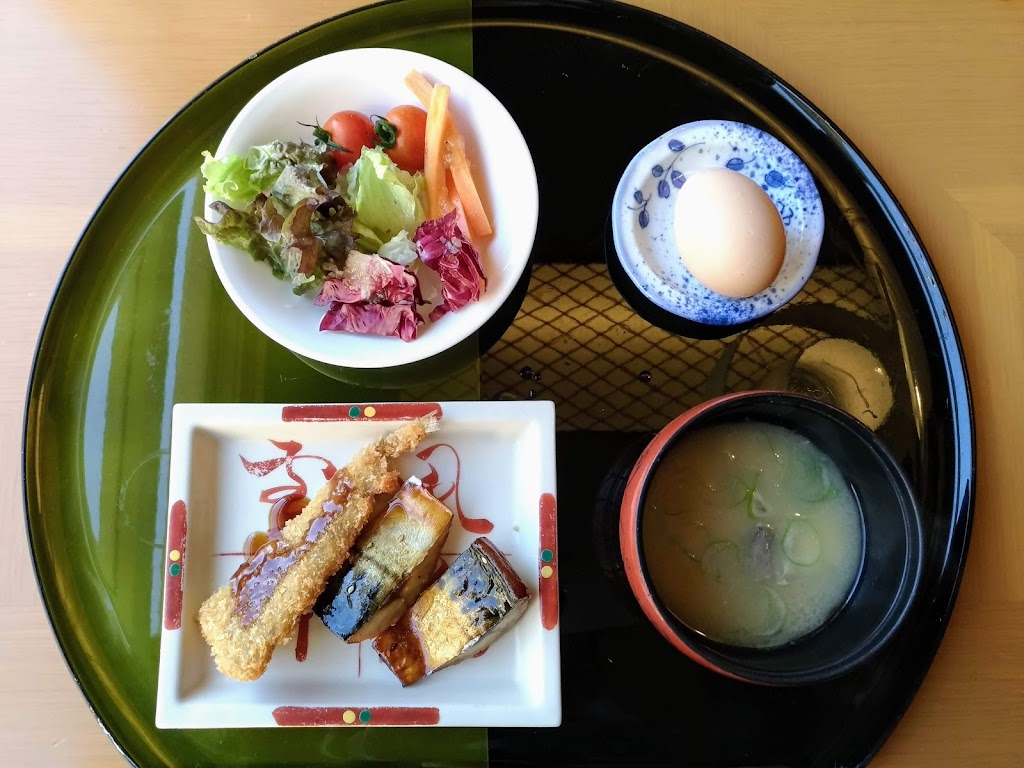 最初のお皿です。野菜はサラダくらいしかありません。脂肪とタンパク源として干物とアジフライ、それにアラ汁と温泉卵です。