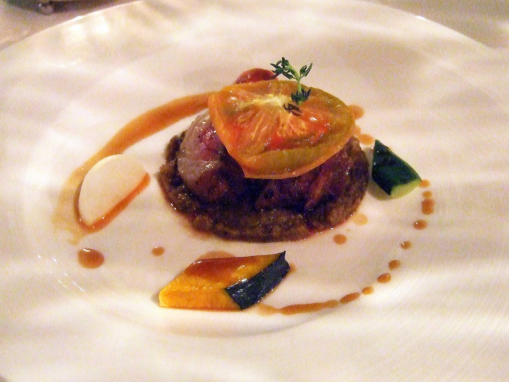 最後にお肉料理は「仔羊背肉のロティ トマトのコンフィとカレー風味の茄子のフォンダン」。これはなかなか脂が乗っていて、ビールのアテにはとてもおいしかったが、脂っぽいのがキライな人もいるかな。