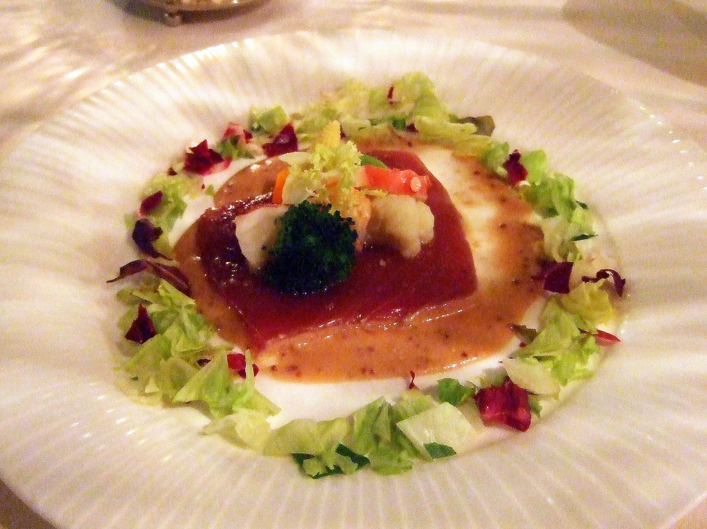 続いて運ばれてきたのはオードブル。「鮪のカルパッチョ オニオンとマスタードドレッシング 海の幸と夏の野菜畑」と題された、大きなマグロの切り身のサラダ仕立てである。