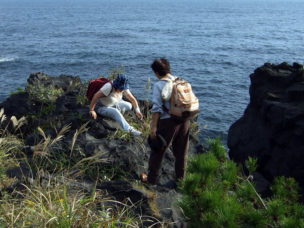 いやー、マジですか(冷汗)。断崖絶壁だし、くさりやロープなどの命綱的なものは何もない。万が一、足を滑らしたらば海の藻くずに…(激汗)。