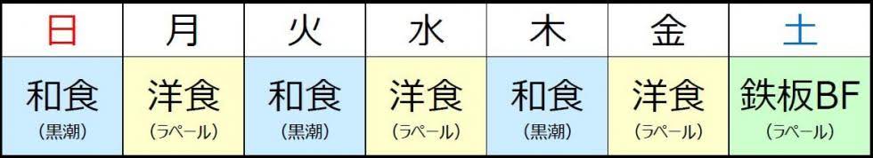 その声に答える形で、この10月から、和食と洋食のコース料理が再開されます。以下の図のように、月・水・金は洋食コース、火・木・日は和食コース、土曜は鉄板ブッフェ、と日替わりでのレストラン営業となりました。