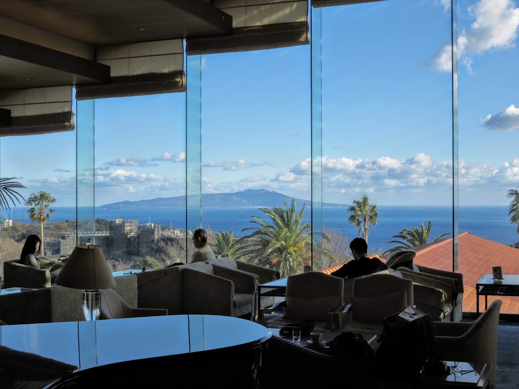 このラウンジはエクシブ伊豆で一番いい場所に作られていて、晴れた日などは海の上にぽっかり浮かんだような、そんな浮遊感、多幸感を得られる実に素敵な場所です。その立地の素晴らしさはもちろん失われていません。