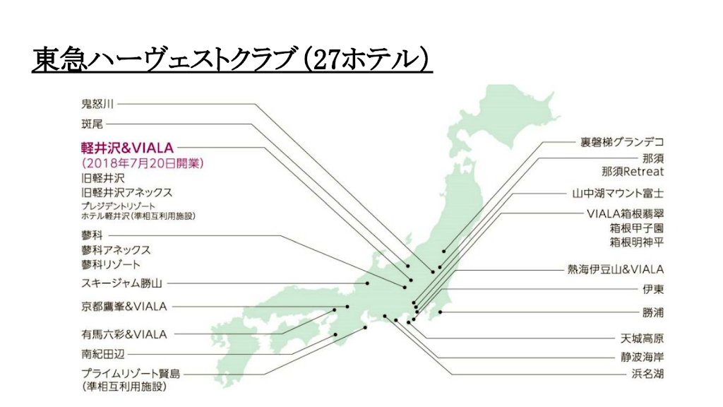 こちらは僕が数えたので、数え間違いがあったらごめんなさい。VIALAの併設についてはダブルカウントしていません(VIALAは東急ハーヴェストクラブのサブブランドで高級仕様のホテルを指す)。それで27拠点あるので、結構あるんだなっていう感じですよね。ただ、エリアで言うと東北の方とか四国・九州にはホテルがありませんね。