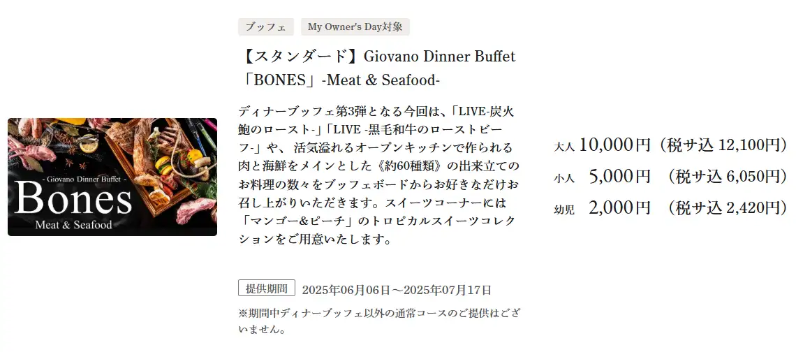 > 2025年06月06日〜2025年07月17日 ※期間中ディナーブッフェ以外の通常コースのご提供はございません。