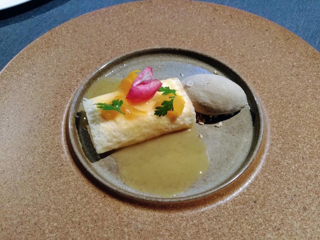 続いてのスープは、トウモロコシの冷製スープでした。冷製ですから涼やかですが、とても濃厚な味わいで満足。