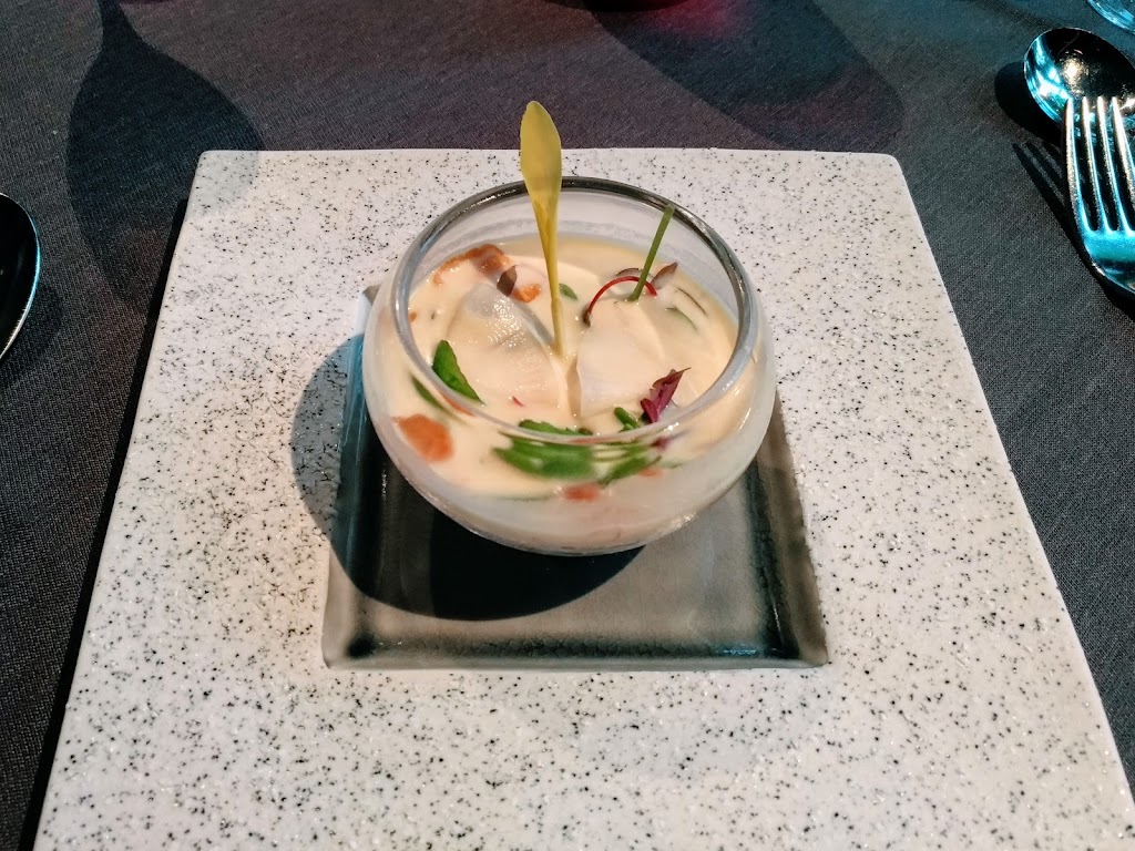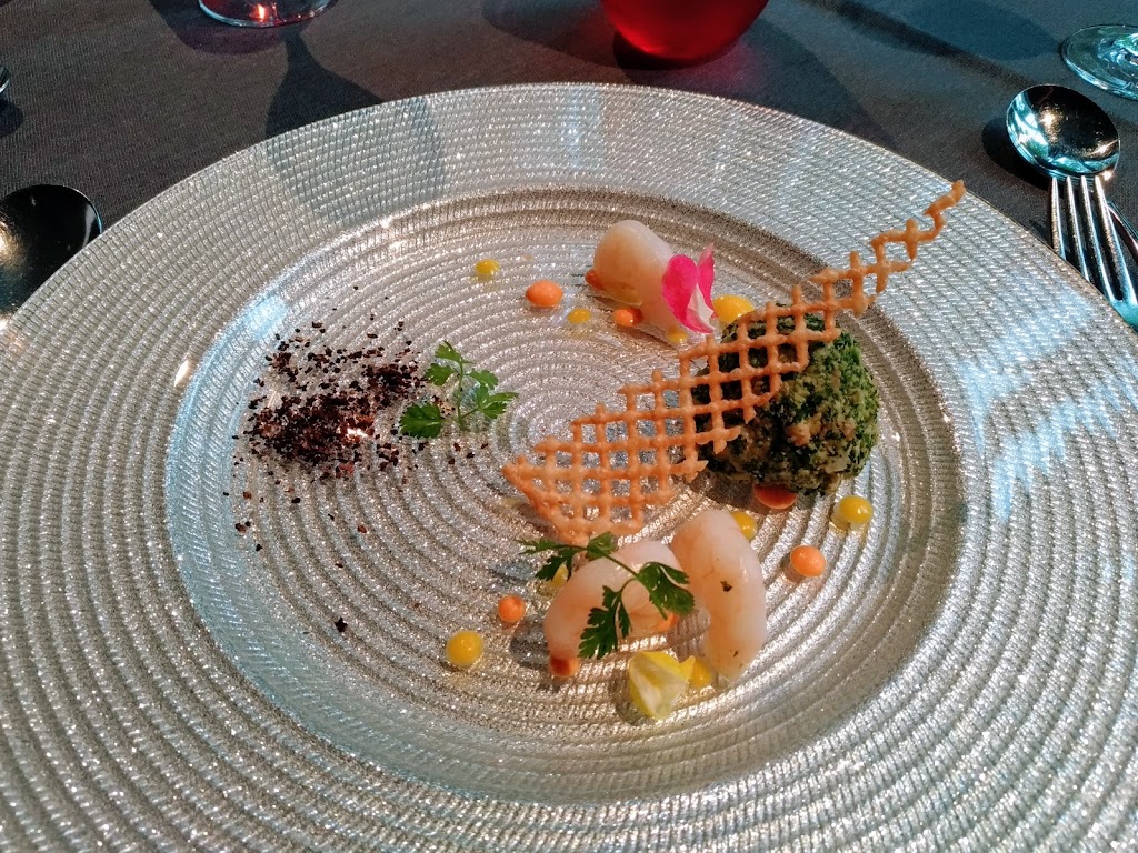 まずオードブルは、真鯛と海老のタルタルでした。右側の緑の盆栽のようなのがタルタルです。盛り付けはちょっともう少しうまくできた気がします。