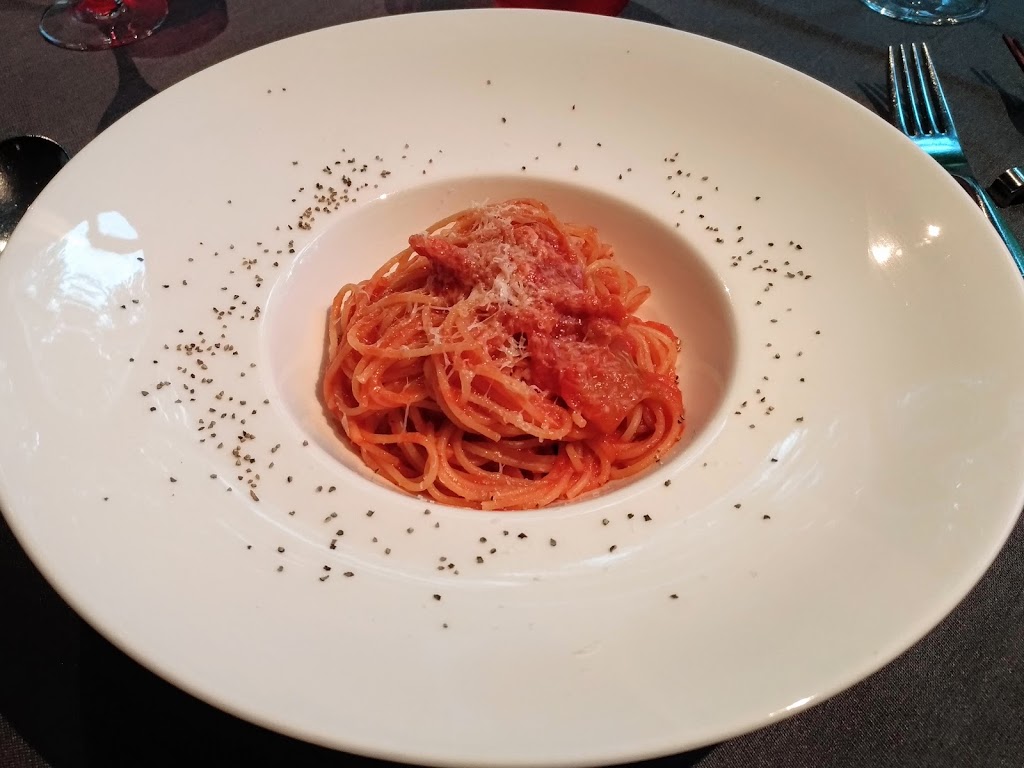 次に、このショートコースでは、ここでパスタが出ます。この日のパスタはアマトリチャーナでした。パスタは細めのスパゲッティーニ。見ての通りのシンプルなパスタですが、茹で具合が絶妙でした。