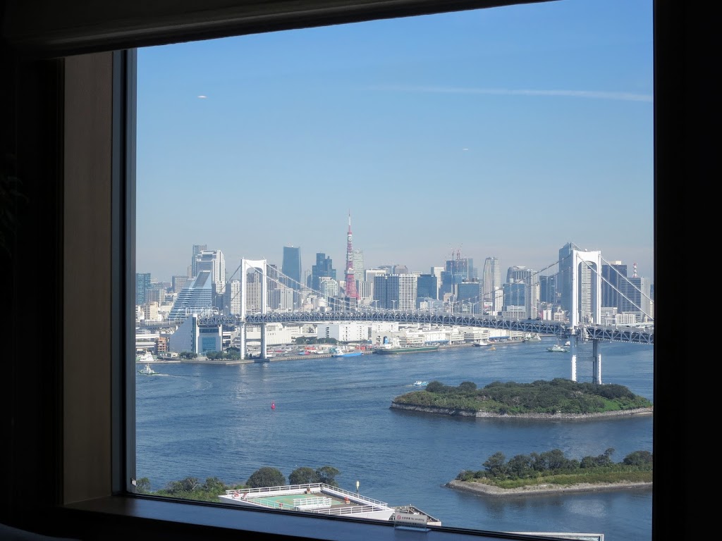 昼は開放的なトーキョーベイのスカイラインが味わえ、窓越しには額縁に入ったようなレインボーブリッジと東京タワーが見えます。下層階だと気になる目の前のヒルトンも、ここからは見下ろす感じです。