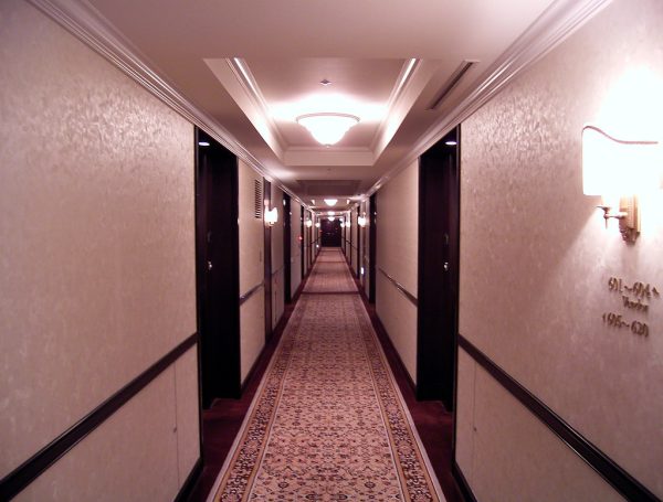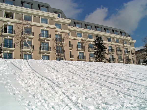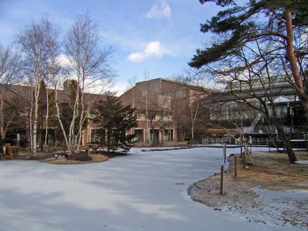エクシブ軽井沢のパンフレットなどでよく見る構図の「真冬バージョン」。冬場には中庭の池は凍ってしまい、屋外の通路も凍結しているので、公式には中庭に立ち入ることはできない。この日は夜のうちに少し雪が降ったので、凍った池の表面…