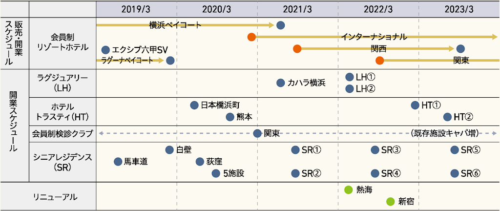 これは昨年4月からの5カ年中期経営計画「Connect 50」として計画されているものですが、これを見ると分かる通り、今期2020年3月期においては、ビジネスホテルのトラスティが2施設開業し、老人ホームもいくつか開業予定があるものの、リゾートトラスト社の主力である会員制リゾートホテルは開業がありません。