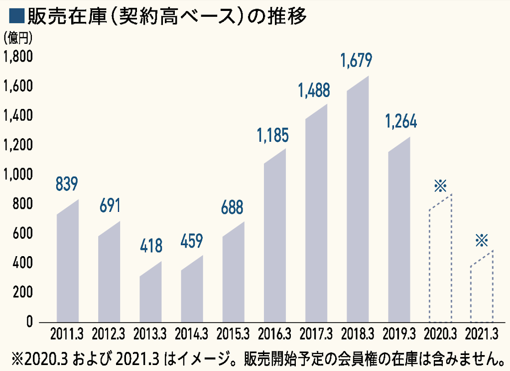 その結果、販売在庫が現在かなり積み上がっていて、このグラフでは、在庫をまずは減らしていきたいということが表現されています。なお、次のリゾートホテルの会員権発売は、2021年3月期に関西地方で、2022年3月期に関東地方で予定があります。皆さんどこだか予想してみてください。ヒントは有価証券報告書にある土地の在庫です。