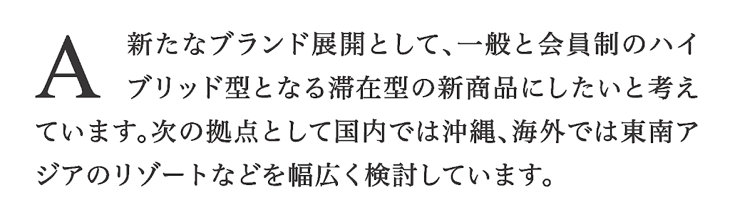 それによると、エクシブやベイコートとは異なる「新たなブランド展開」を行うとされています。また、対象となるホテルは「一般と会員制のハイブリッド型」であるとされており、さらにそのホテルは「滞在型」であるとされています。回答では、まだ発売もされてないのに「次の拠点」と言っていて、「初回の拠点」がどこなのかが分かりませんが、ともあれ「沖縄」や「東南アジア」などが今後検討されるようです。