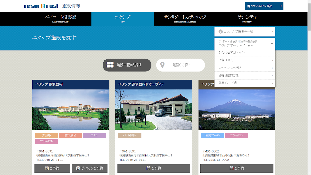3.表示されたページ(施設情報「エクシブ施設を探す」)右上にある「エクシブオーナーメニュー」(白いボタン)にカーソルを合わせると、占有日照会やスペースバンク預入などの各メニューが表示されます。