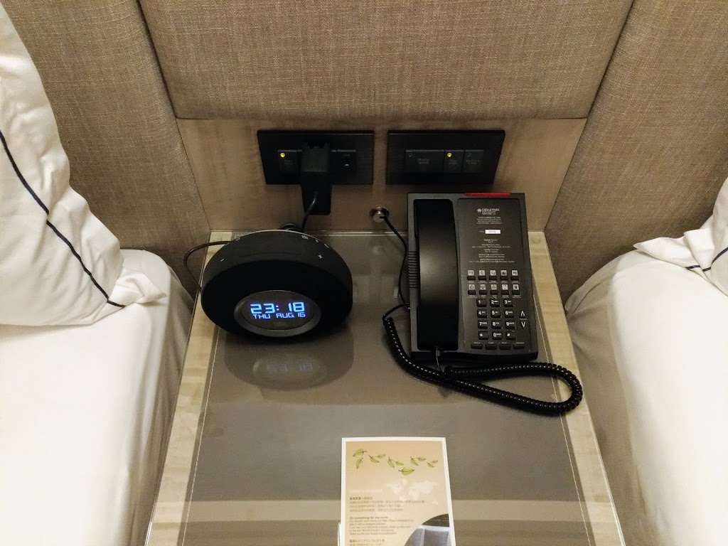また、電源関係は2つのベッドの間にまとめられていますから、スペースの制約が出てしまった格好です(それをカバーするためか、デイベッドの方にも電源が付いていました)。