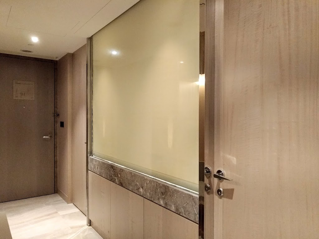 これは前室の様子なのですが、右側にガラスを通して、バスルームが丸見えになっているのが分かると思います。