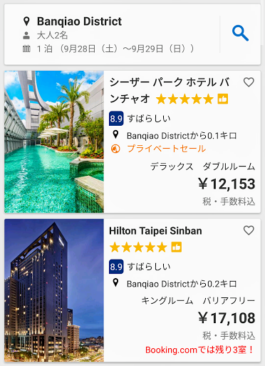 どのくらいかというと、Booking.comで1カ月ほど先の最低料金を調べたのがこちらです。