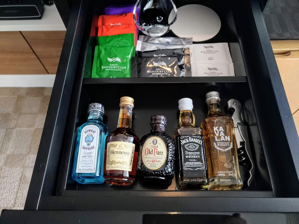 このように小瓶の洋酒も揃っています。奥にあるのが、無料のティーバッグ類です。