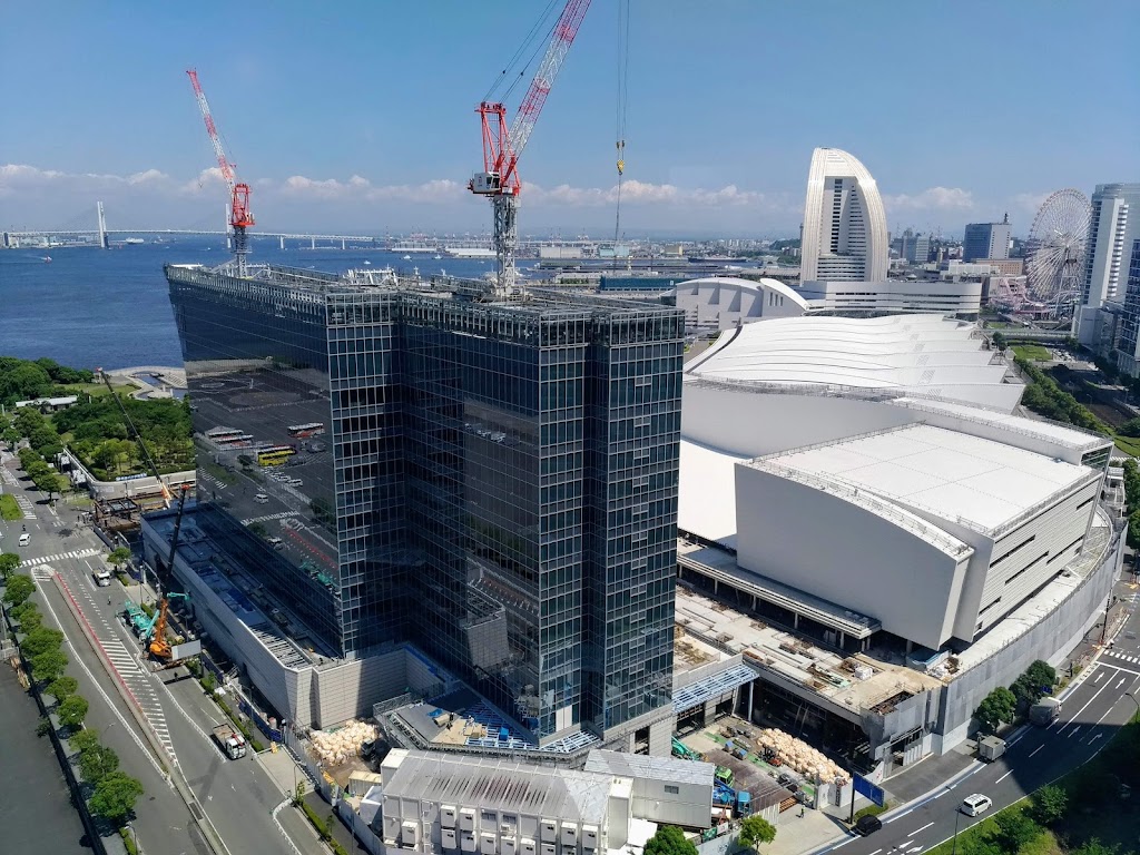 こちらは、背後にあるホテルの20階から、カハラ&ベイコートと、現在建築中の「パシフィコ横浜ノース」を撮影したものです。奥に見える白い展示場部分が、以前からあるパシフィコ横浜で、そしてその後ろにヨコハマ グランド インターコンチネンタル ホテルが見えます。